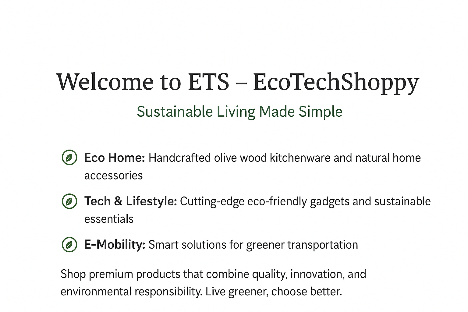 At ETS, we focus on green innovation, modern lifestyle products, and sustainable solutions. From Eco Home - Eco-friendly Gadgets and accessories to Electric Mobility— everything is carefully selected to help you live smarter with sustainability and ecology in mind.